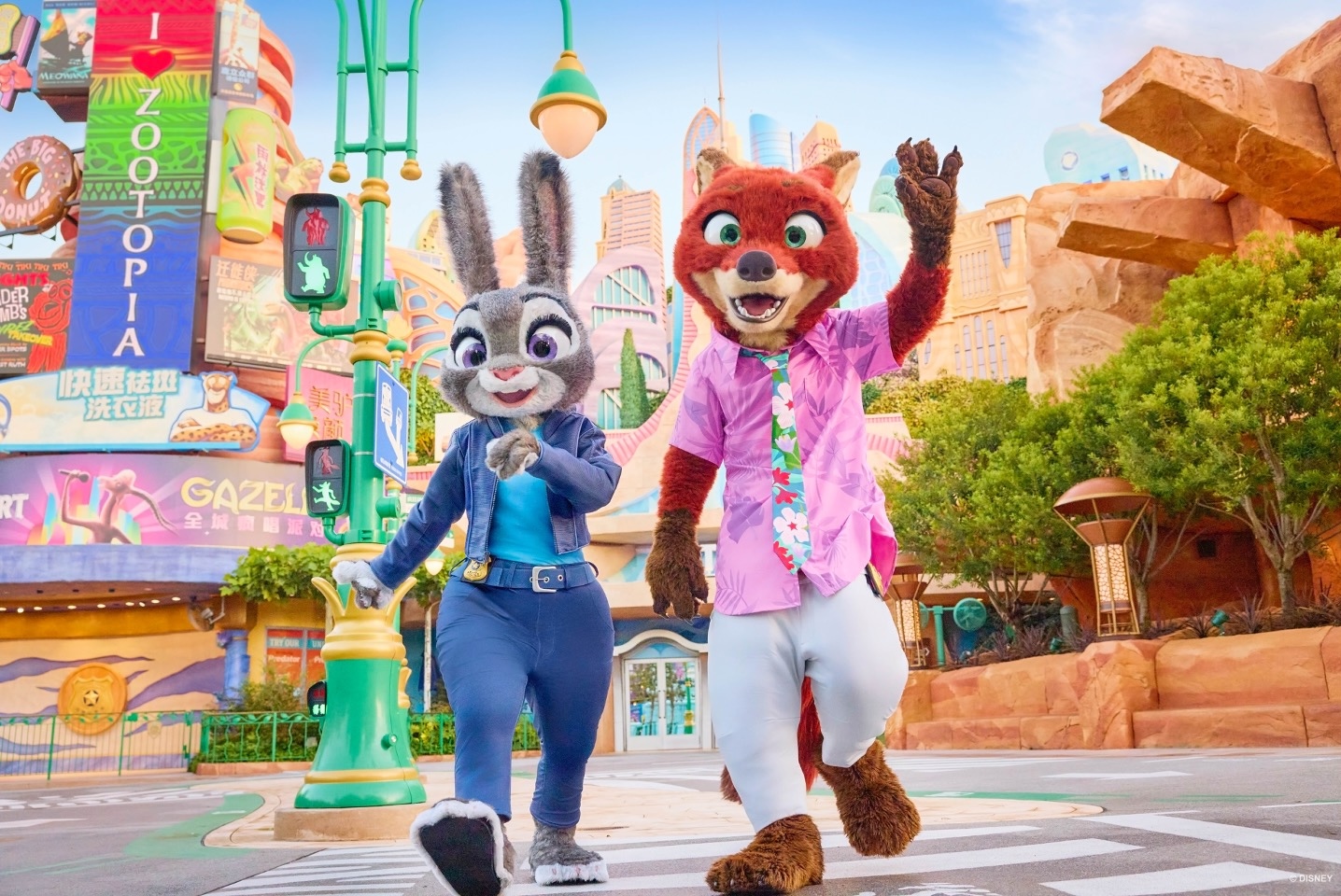 Judy Hopps and Nick Wilde wear new Zootopia 2 costumes at Shanghai Disney Resort.