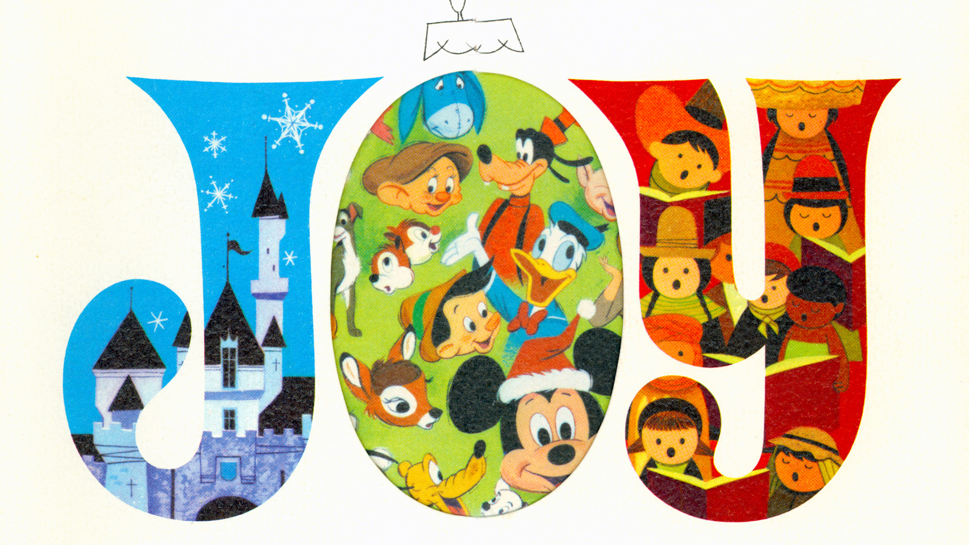 Although the world lost its master showman in December 1966, the tradition of Disney studio Christmas cards continued in the years to follow. A favorite from the next decade, the 1974 card opened to reveal a train of sleds and sleighs carrying popular Disney characters, from early stars like Mickey, the Three Little Pigs, and Dumbo; to newer personalities like Baloo, Scat Cat, and Robin Hood—a testament to both the enduring legacy of Walt Disney and the promise of a bright future for “the finest in family entertainment.”