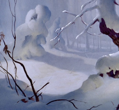 The classic Disney animated film Bambi takes place in one year, through the changing of the seasons, with much of the film’s memorable story set during a winter that’s both difficult and filled with fun (like ice “skating”). This meticulously hand-painted animation background from Bambi, created during the film’s production in 1940, perfectly captures the timeless spirit of the movie. It’s equally enticing—who wouldn’t love to explore an untouched forest filled with snow?—and atmospheric. Though seen only fleetingly in the film, it’s a perfect example of the way every frame of Disney animation is its own work of art. The snowy woods will in time give way to spring and the miracle of new life, but for now as winter draws near for many Disney fans around the world, we hope you enjoy this quiet moment from Bambi with our wishes for a happy holiday season.