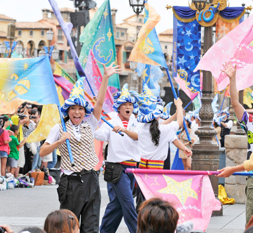 As Mickey Mouse calls out "Be Magical!" together with the guests, the magic spreads throughout the area, bringing Disney characters and dancers dressed in 10th anniversary costumes to Mediterranean Harbor.