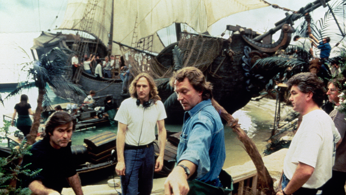 Principal photography began on Muppet Treasure Island on April 3, 1995, and Muppet mayhem ruled the cinematic seas for 14 weeks on 13 major sets. Shooting started on Bristol Docks, one of the vast sets designed by Val Strazovec. It covered a complete stage, with the port dominated by the majestic ship, the Hispaniola. “I originally thought that the boat and the port should be on separate stages,” Val once explained, “but I realized that it would be nicer to have the ship right there on the port. This meant, with only a relatively small area to work with, that I had to force the perspective tremendously. It became very technical working out how much I could force the perspective without making it look obvious.” Actors, Muppet performers, live animals, and crew vied for space on the docks that had 80,000 gallons of water on one side and houses diminishing in size on the other. The 18-ton galleon, constructed of fiberglass and wood, was set on a computer-driven gimbal, the first of its kind. “The whole of the boat was pivoted on one center point with huge hydraulic cylinders that were capable of pushing 50 tons either side,” explained special effects supervisor Nick Allder. “We could select any basic speed, which would be repeated until changed.” Unfortunately for the cast and crew, the movement was too realistic. “Quite a few got seasick when we were shooting in the galley,” Allder once said. “Then we found that the seasick pills put them to sleep!” The floor of the boat was taken out most of the time to allow the Muppet performers to operate.
