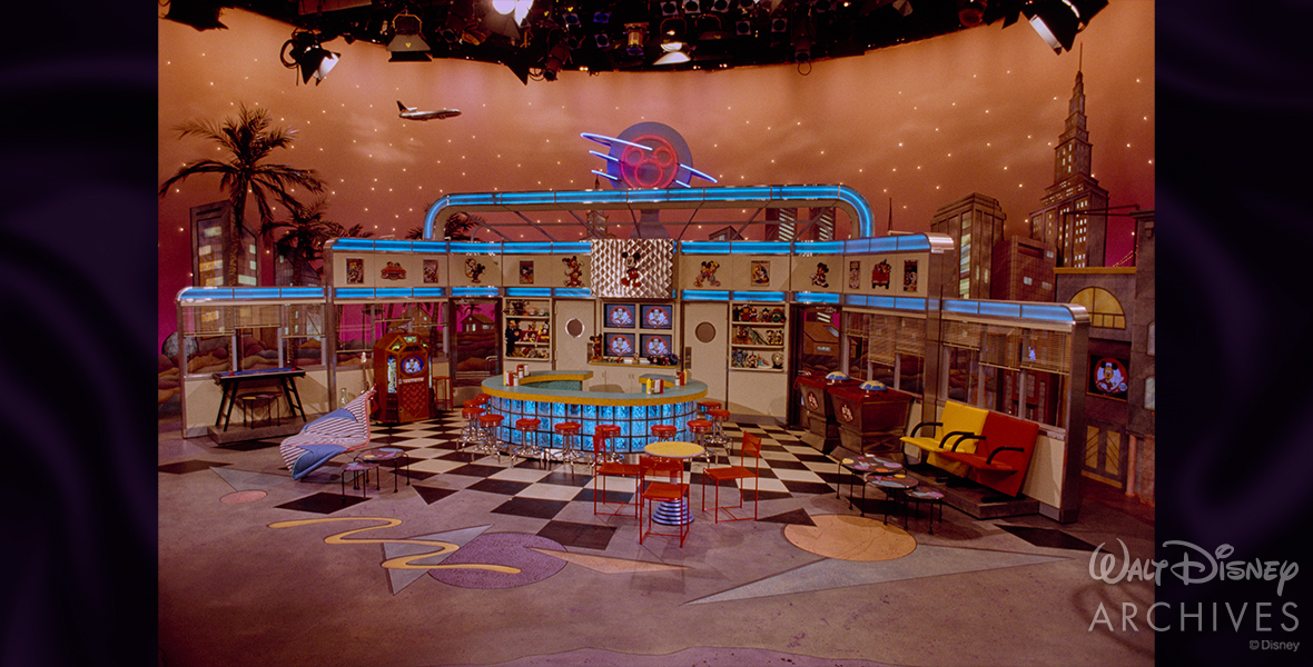 An empty stage set at Disney-MGM Studios for The All New Mickey Mouse Club, with a plane in the backdrop. Red chairs, tables, and a circular bar are visible on the set. © Disney